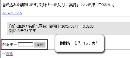 ユーザが削除キーを指定して、記事の削除を 行う事ができます。 |