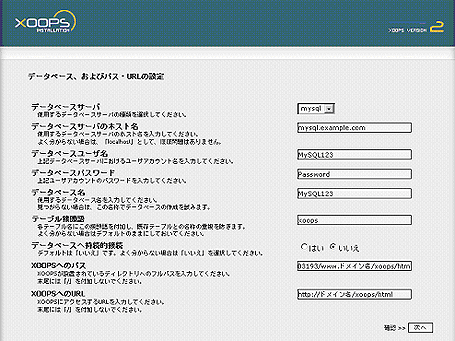 データベース設定の確認をし、次へ進んでください。